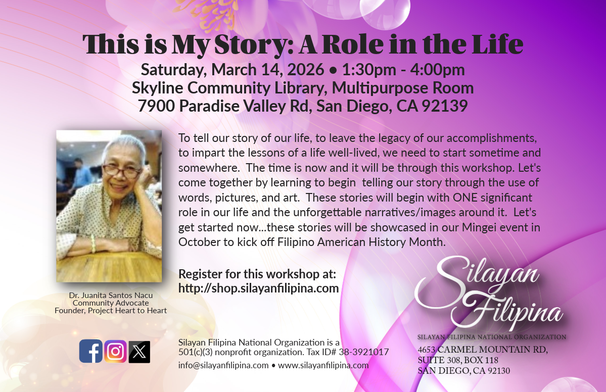Let your story be known through words, pictures and art led by Dr. Juanita Santos Nacu. These stories will be showcased in our Mingei event in October to kick off Filipino American History Month.